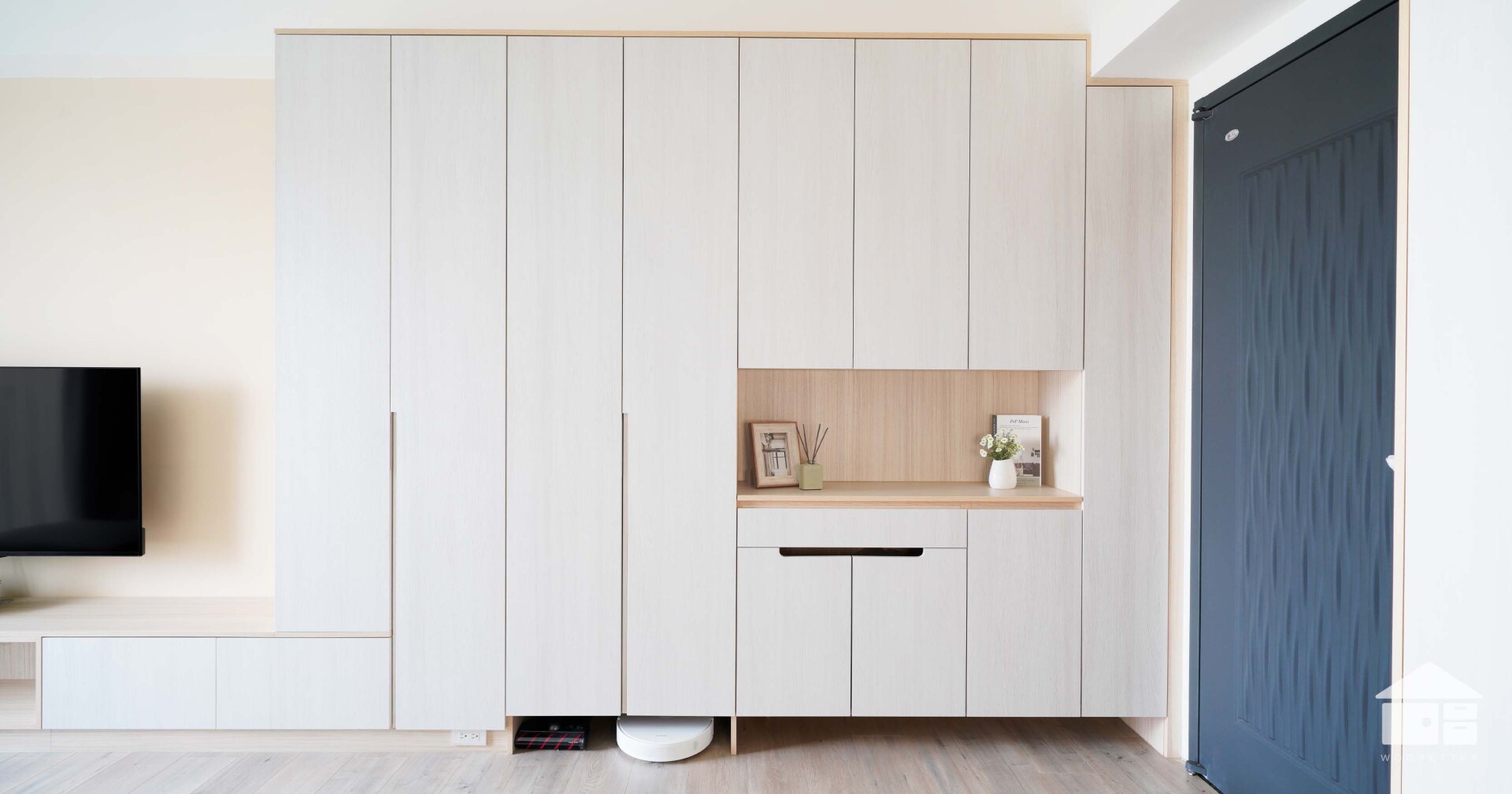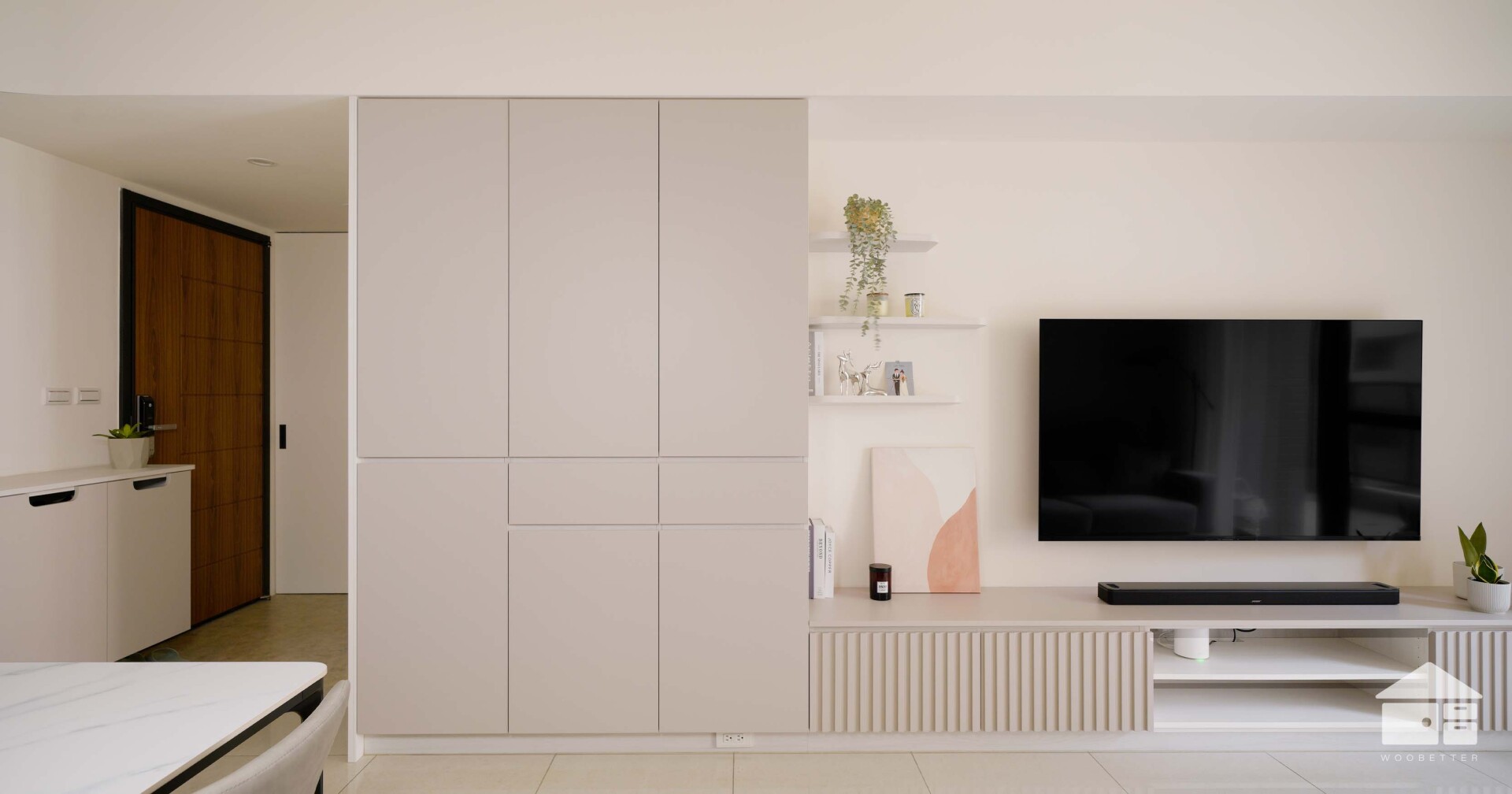 若櫃體選用與牆面相近的色系或低彩度色系,視覺線條能自然而然地延伸,使界線變得柔和,空間也隨之清爽純粹。