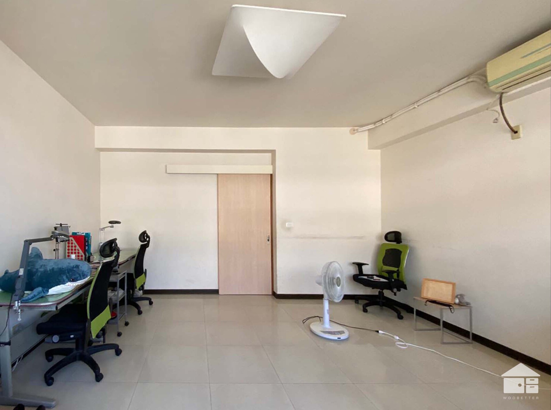 原本的空間因桌椅零散地配置於房間邊緣,導致中央大片區域被閒置浪費,未能發揮空間的最大價值。為了釋放空間潛能,設計師首先從消除視覺雜訊開始:透過木作天花板將老舊的冷氣機與管線完美隱藏,並換上柔和的內嵌式燈光,讓室內照明變得均勻而舒適。