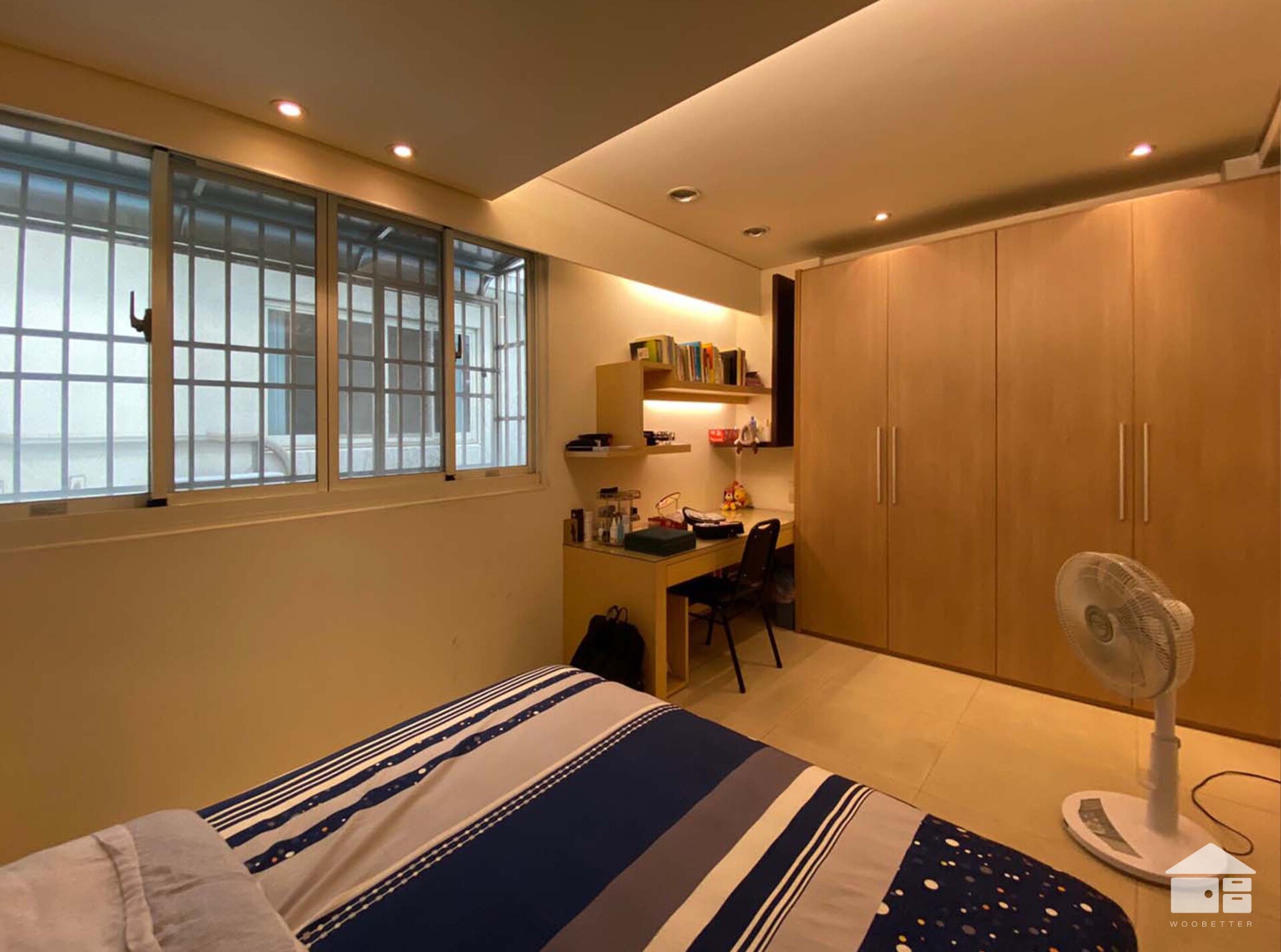 設計師將原本堆放雜物的房間,重新規劃為男孩房。空間整體色調採用了清新的淺木色搭配簡約的白色,營造出一個充滿活力、明亮舒適的空間。為了創造更舒適的頂部視覺,設計師將外露的管線與原有的銳利梁柱,巧妙地隱藏在平整的天花板中,讓臥房的視覺更加整潔協調。