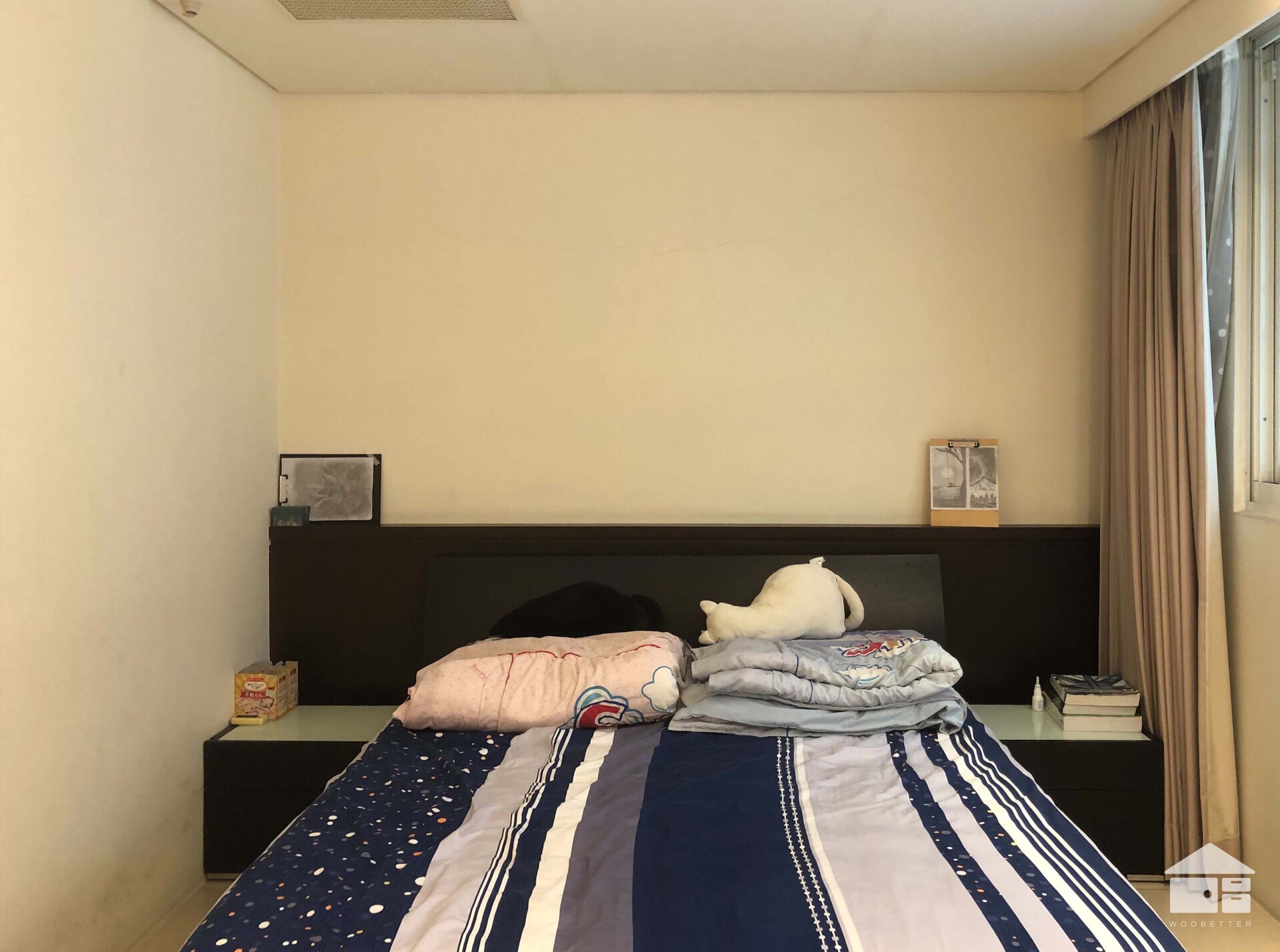 家具配置也做了巧妙的調整:原本居中擺放的床鋪,侷限了兩側的運用,設計師將其調整至靠牆處,並設計了一組結合展示層架、封閉式收納和床頭几功能的複合式收納櫃。櫃體邊緣細心地以圓弧導角收邊,無聲地呵護居住者的安全,圓潤的造型也讓空間更添趣味。