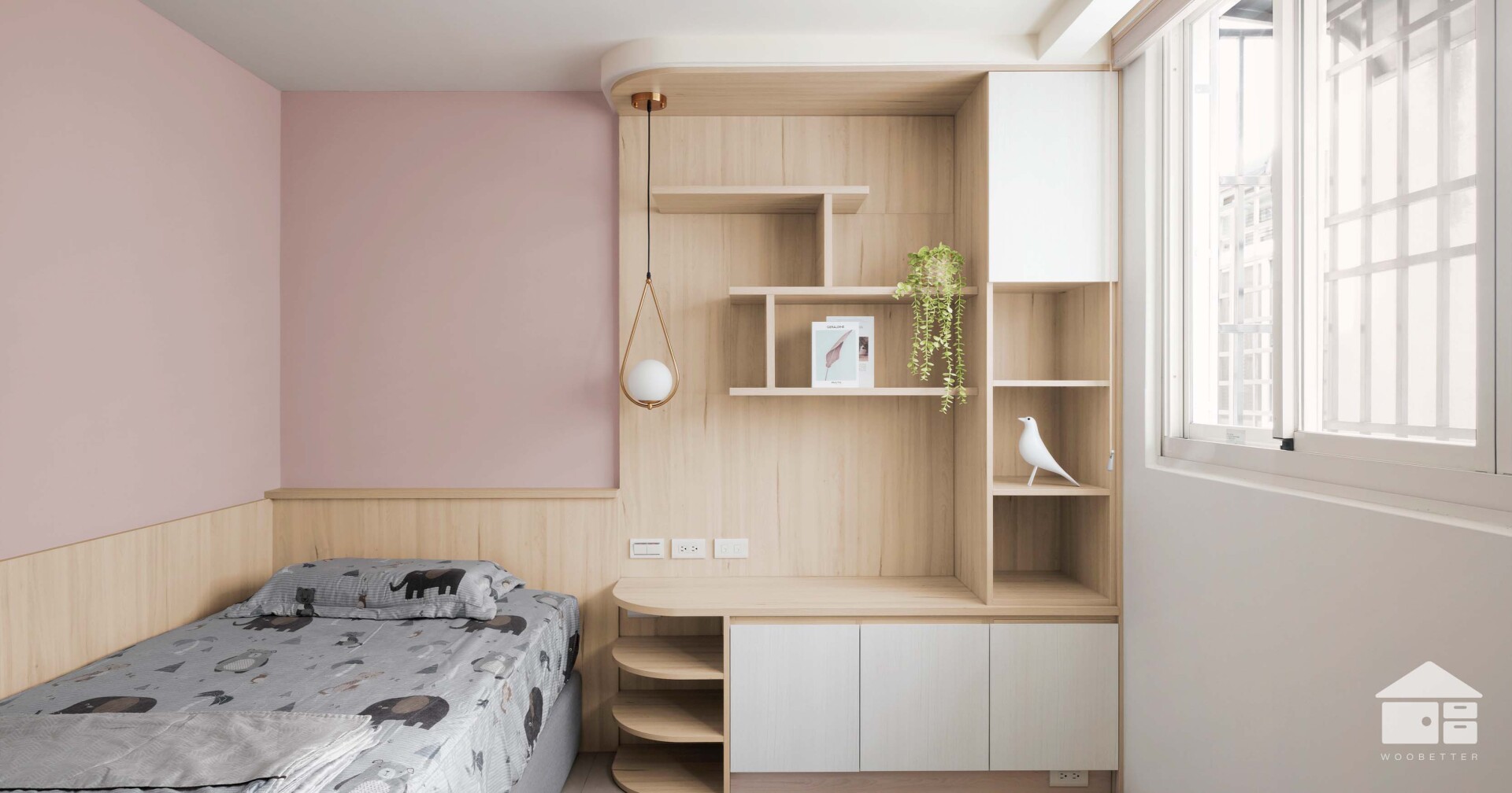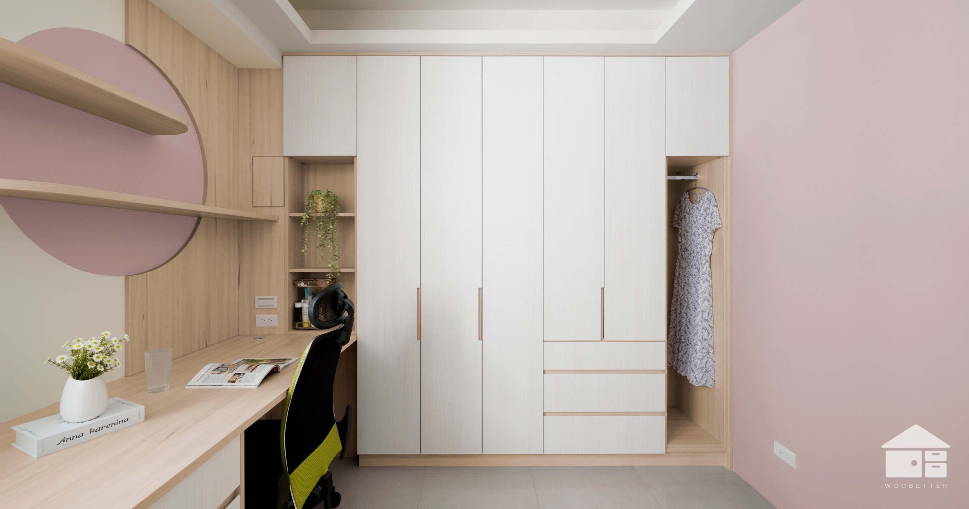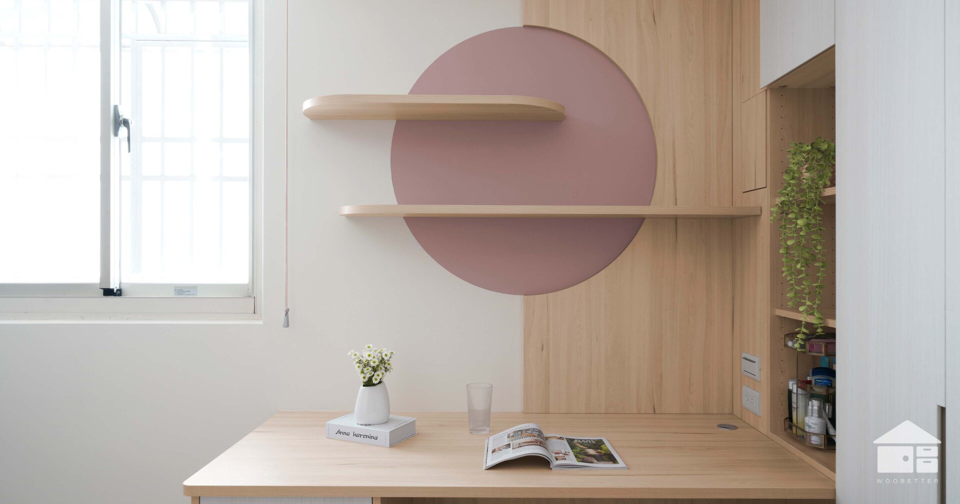 臥房另一側的書桌牆面,以溫柔的藕粉色圓形色塊,搭配圓弧木質層板,打造出充滿想像力的個人天地。原先延伸至書桌的窗簾盒也被簡化處理,讓窗外光線得以更輕盈地灑入室內。