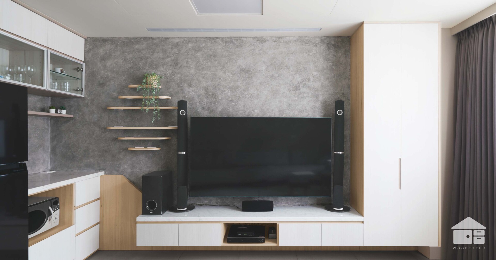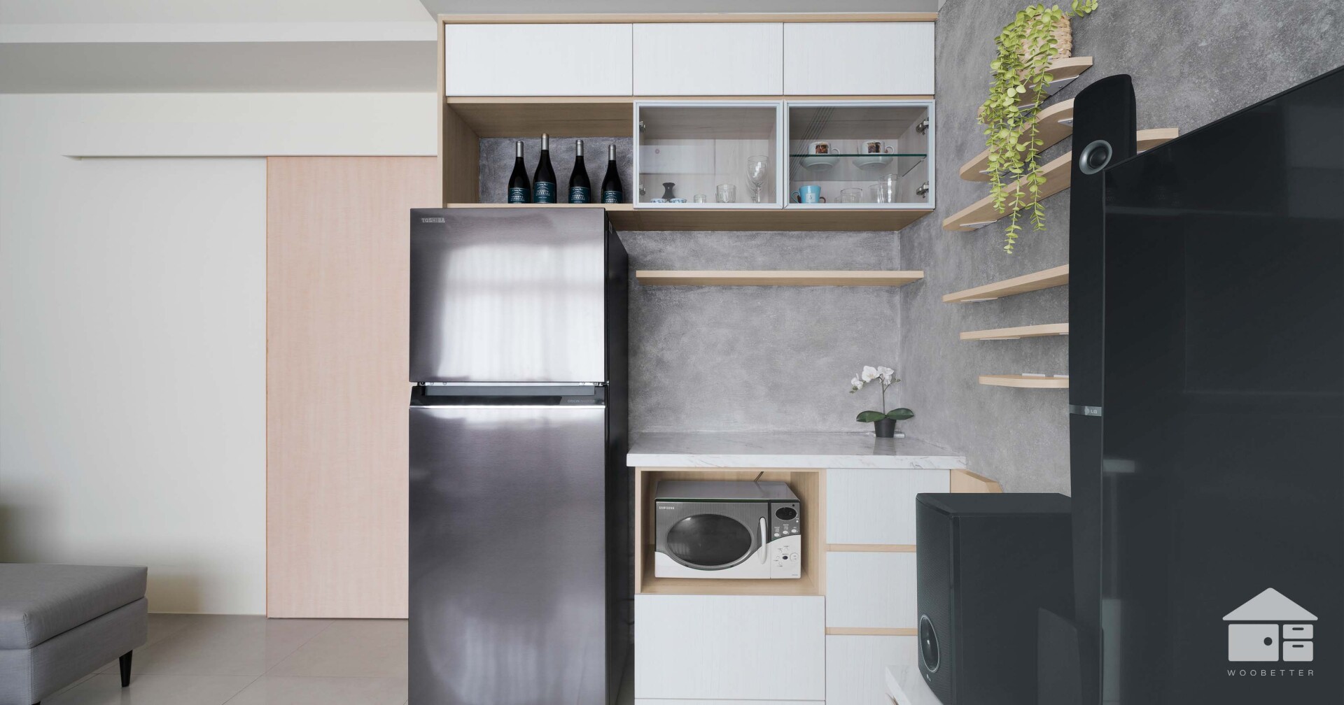 電視主牆以灰色藝術漆,為視聽區奠定了簡約大方的現代基調,下方搭配懸浮電視櫃,在提供收納的同時,也創造了輕盈的視覺效果。電視櫃旁,冰箱與備餐功能被優雅地整合於一側,形成一個複合式的輕食角落。這份貼心的整合,讓空間不再僅限於影音功能,更成為全家人能隨時取用點心、輕鬆交流的生活場域。