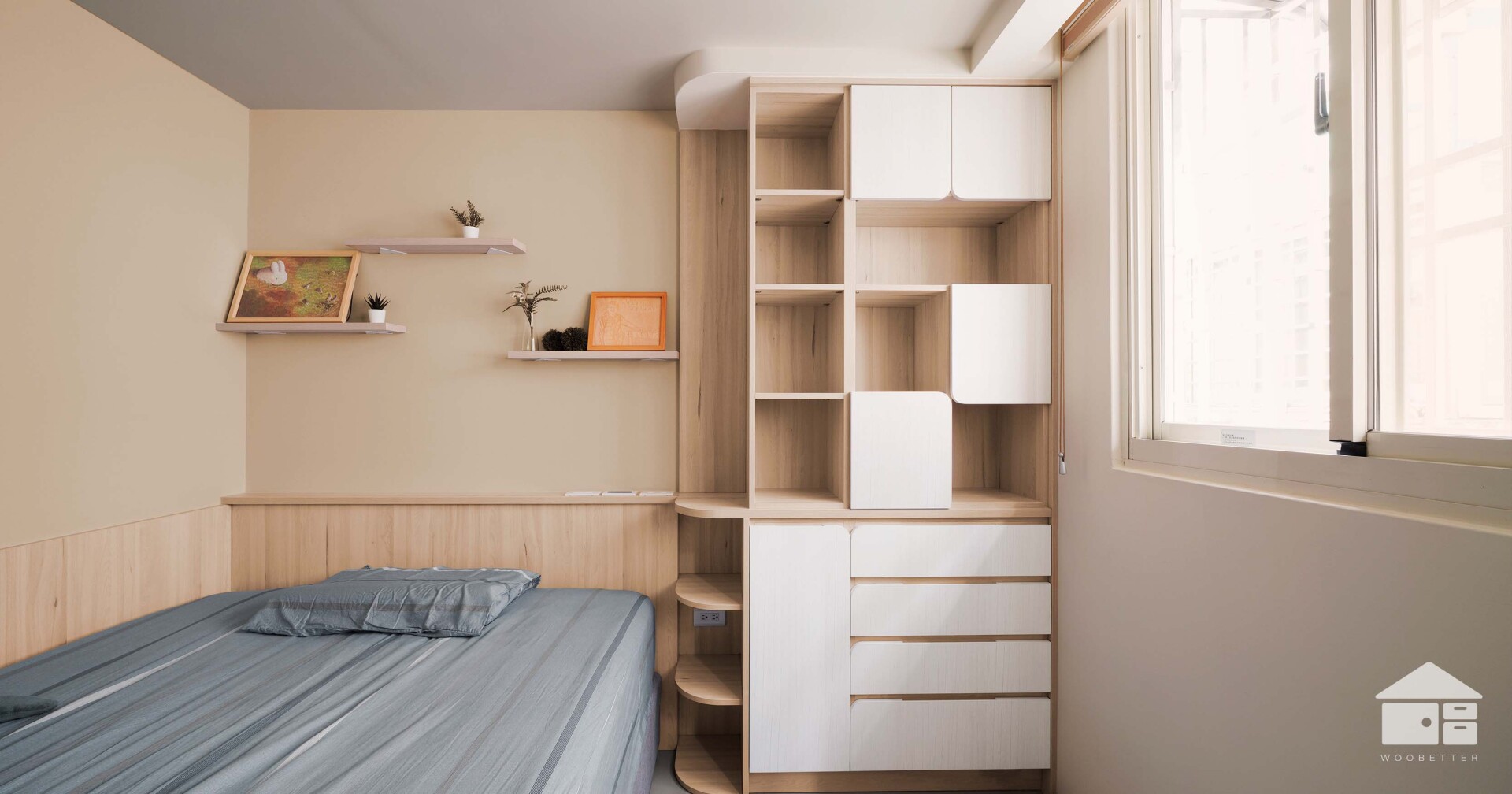 目光順著天花板來到立面,黃沙色的床頭牆為臥眠時光鍍上了一層溫暖的濾鏡。床邊的收納系統,以不規律的開放格與門片交錯設計,打破了制式的櫃體印象,帶來活潑的收納趣味,並以圓弧導角柔化了櫃體的線條。