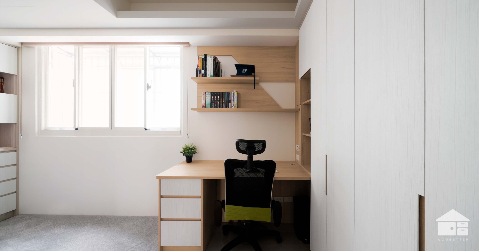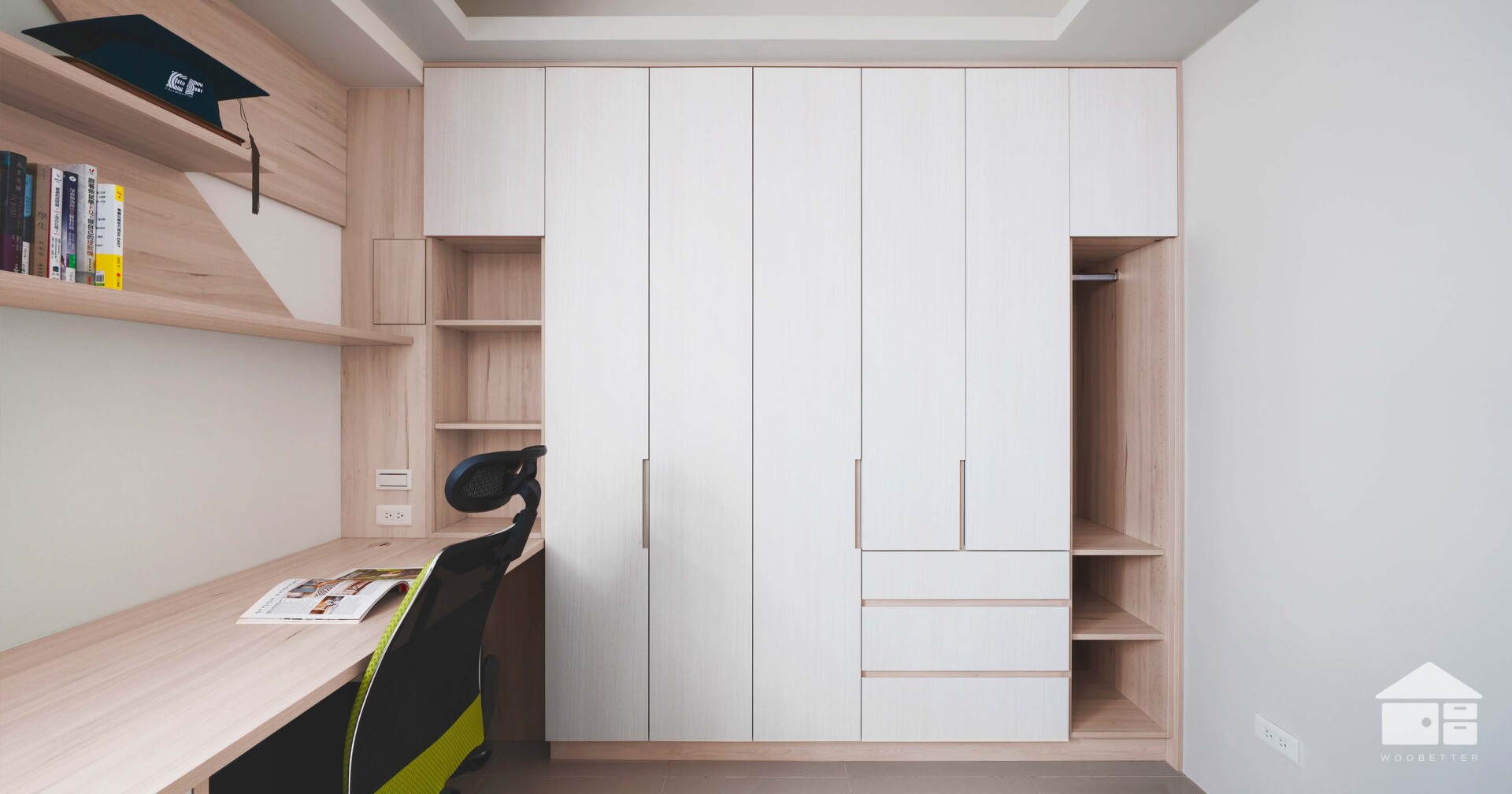 書桌上方的層架設計,採用俐落的幾何切面,呈現出穩定而沉靜的氣質。緊鄰書桌的衣櫃規劃了充足的大面收納,滿足男孩成長階段的置衣需求。其中更貼心設置了汙衣格,讓穿過的衣物或用過的濕毛巾,有專屬的放置空間,避免異味或濕氣影響到其他乾淨衣物。