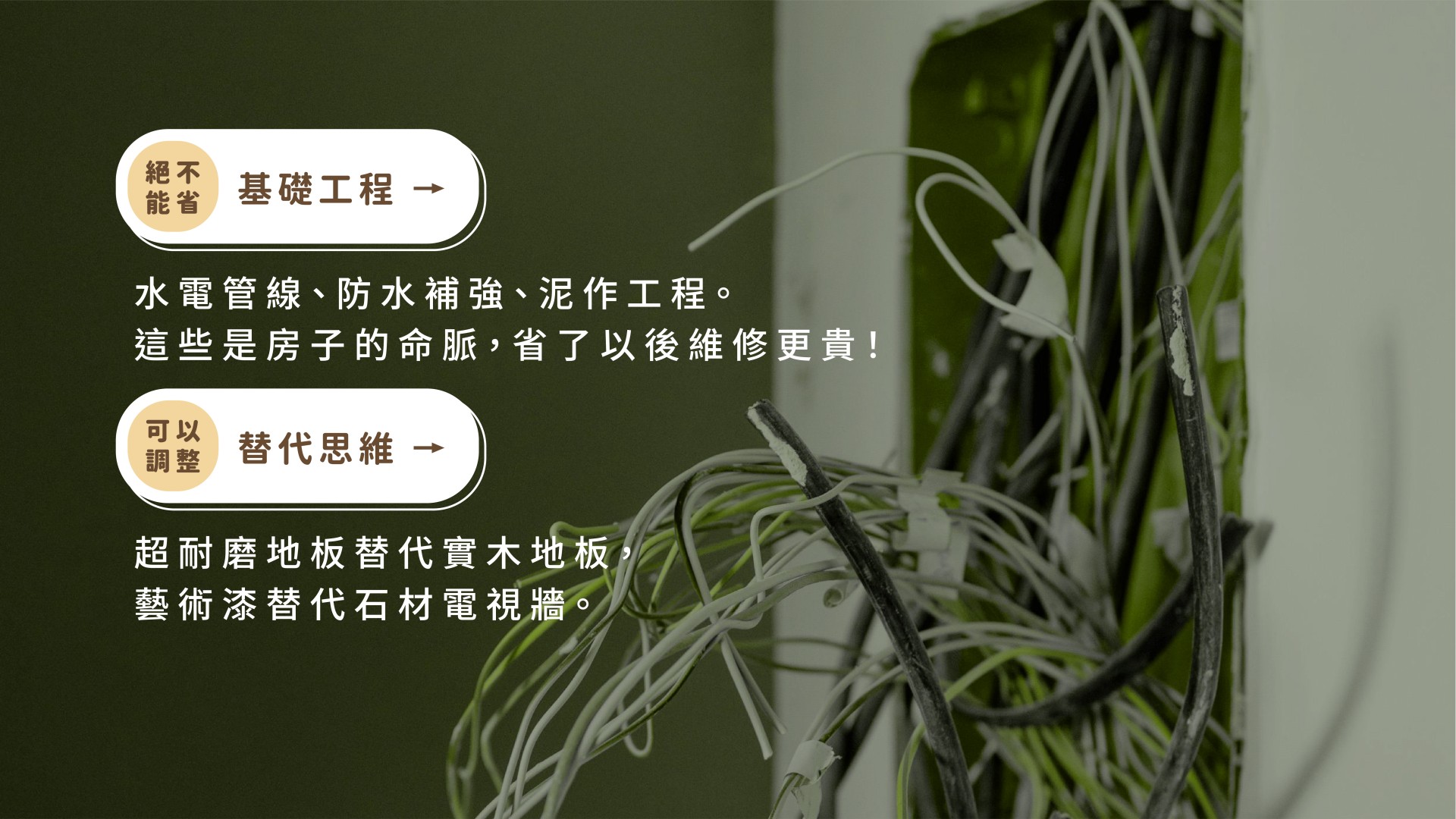 【實用優先】預算集中在收納機能、管線安全、動線優化與生活便利性,而非視覺修飾。