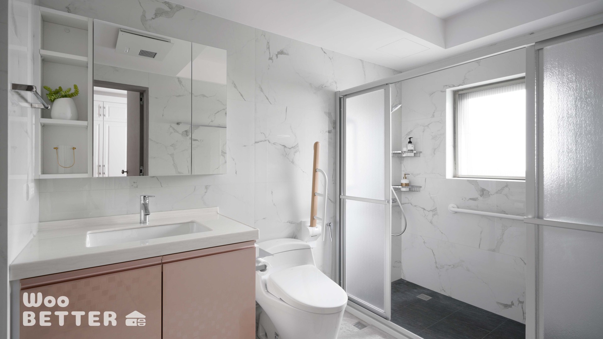 針對熟齡需求,全面優化衛浴設施,導入止滑地磚、扶手與低門檻滑門。