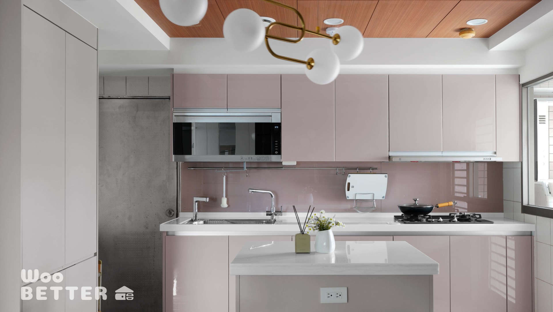 廚房換裝具光澤感的淺粉系櫃體,搭配中島與餐桌連結設計,並在天花板增設飾板與內嵌照明。