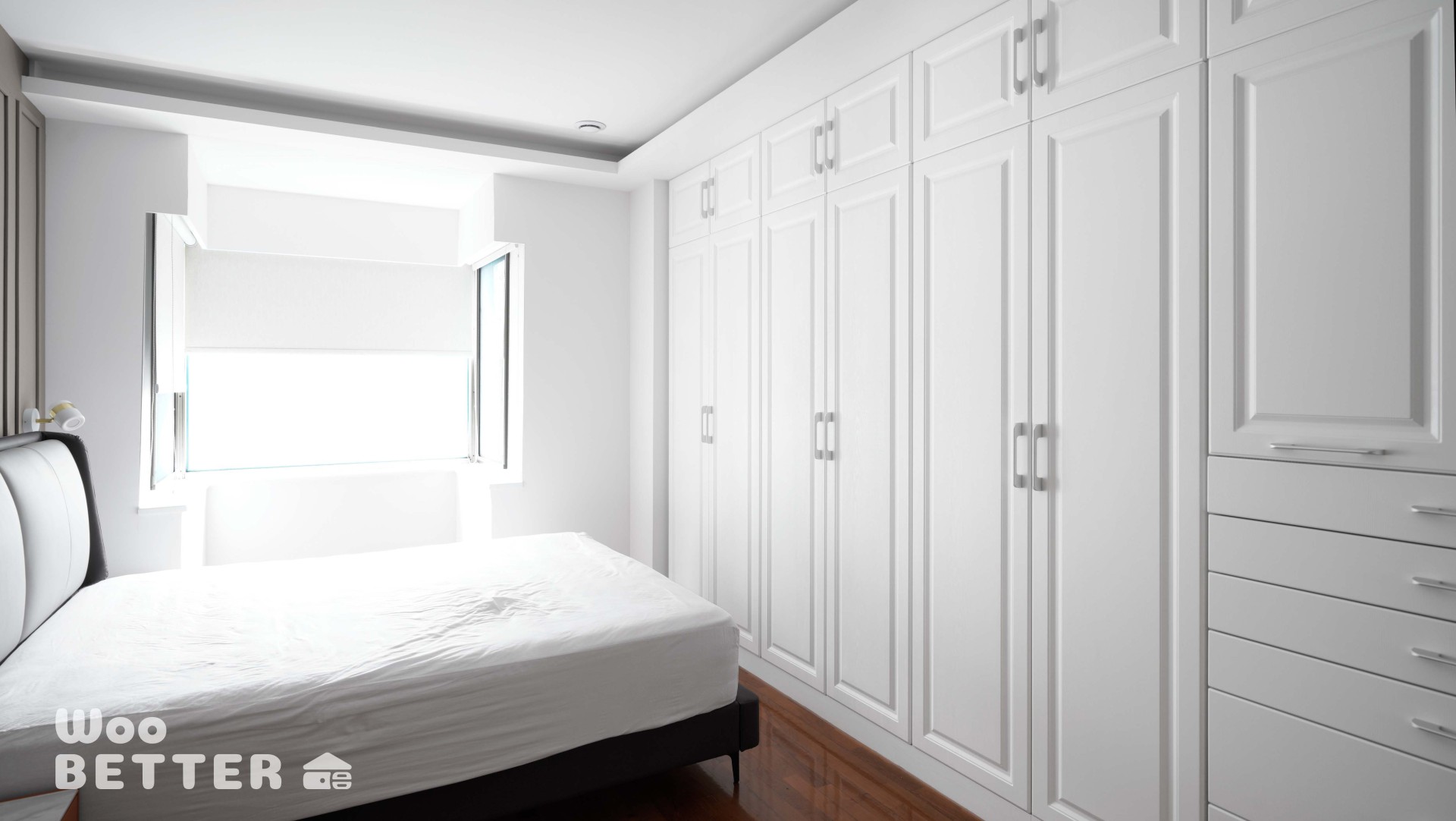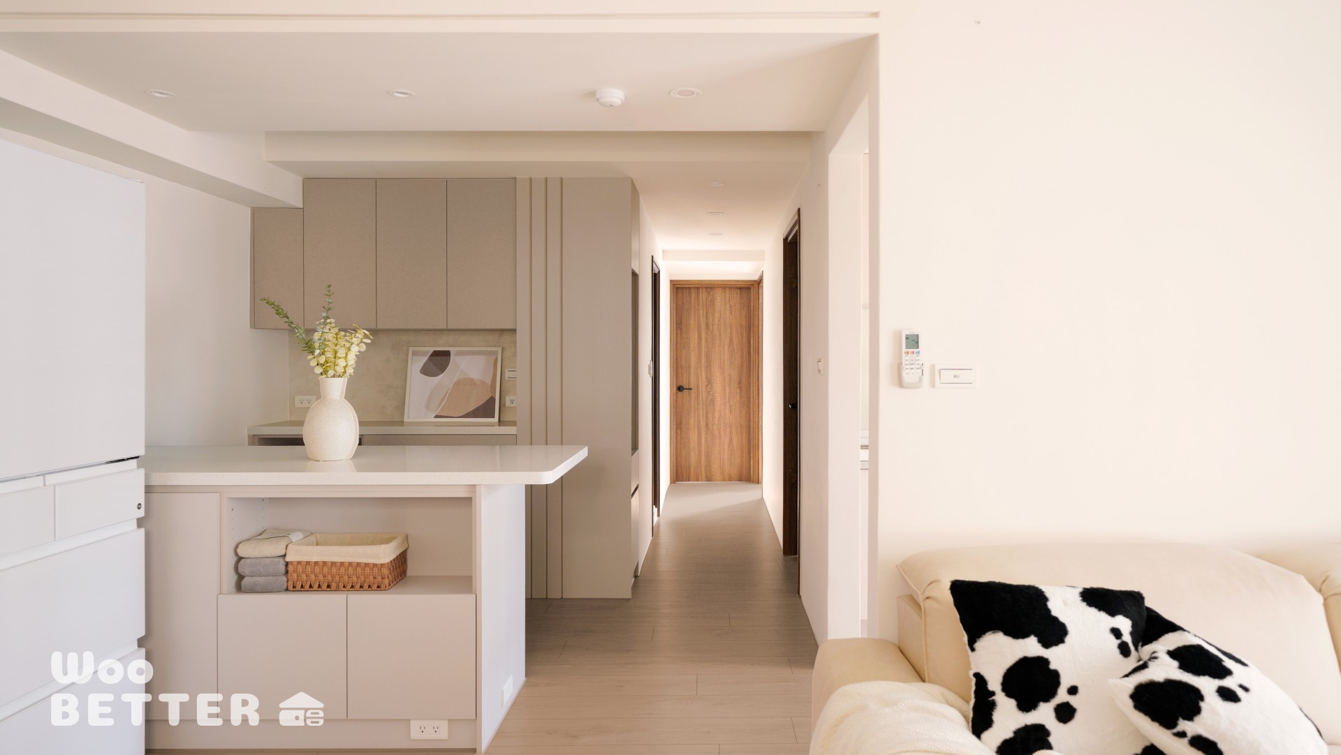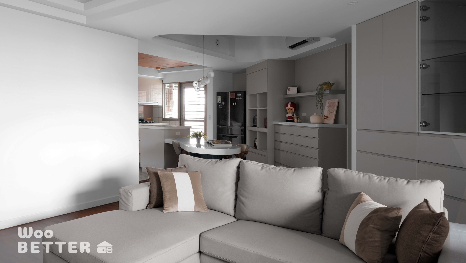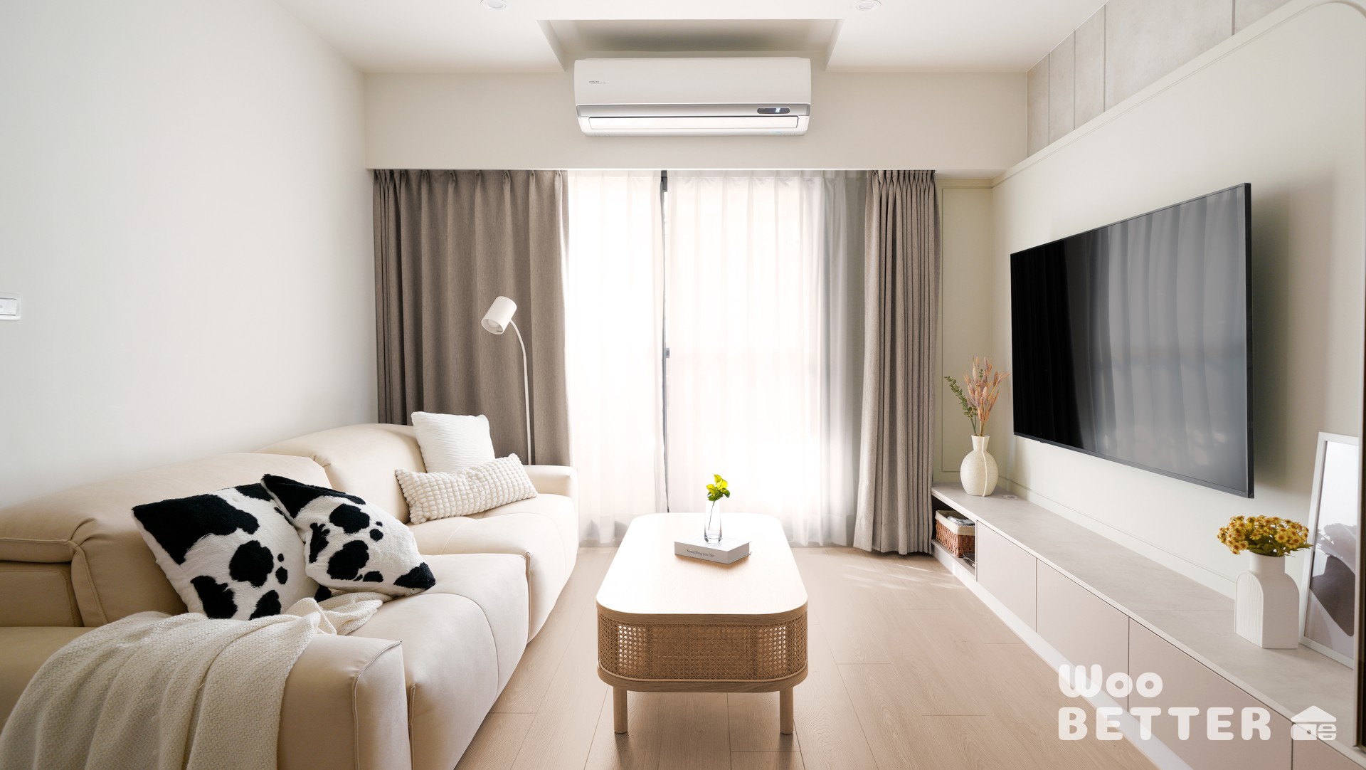 將原本零散的家具與懸掛式神明桌,整合為一體化淺色收納牆,增加儲物空間,並減低碰撞隱患,同時簡化視覺複雜度。