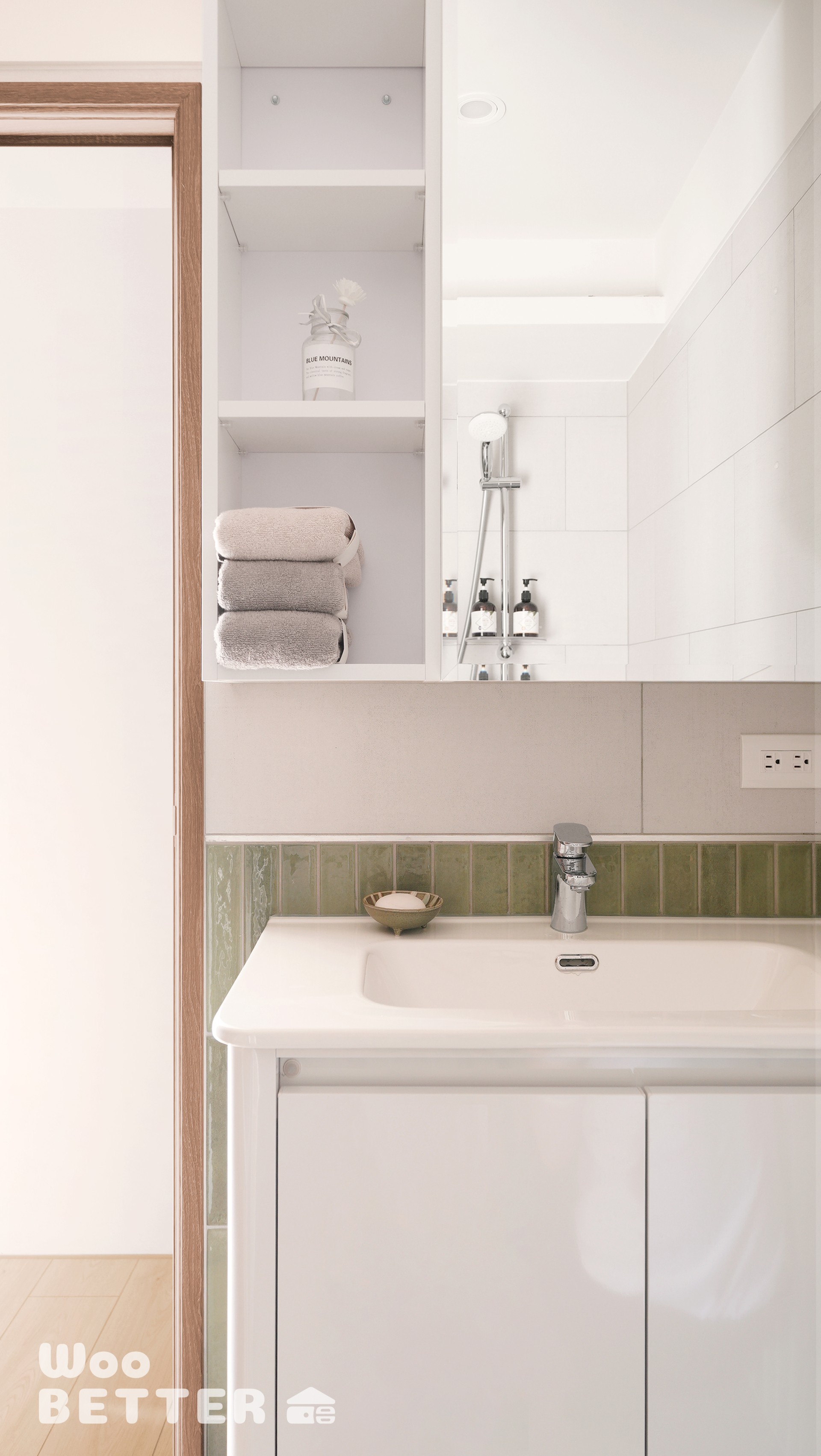 全室以溫潤的米灰木紋與可可色系為基調,局部點綴復古元素(如:玄關藍調六角磚、衛浴復古綠色長條磚),並透過茶色玻璃與金屬刷漆飾板的細節堆疊,在現代簡約中注入優雅的懷舊情調。